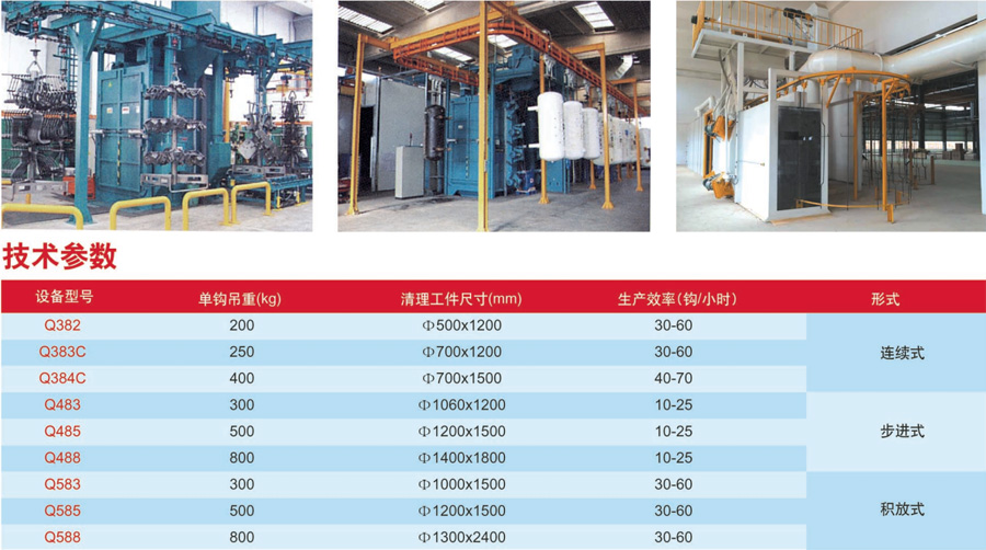 Q38/48/Q58系列悬链通过式抛丸机随吊链移动方式,可分为连续式、步进式、积放式。本机适合多品种、大批量铸铁件、铸钢件、锻件及钢结构件的表面清理及抛丸强化,如发动机缸体盖、电机壳体、轮毂、钢瓶等清理效果尤佳。是汽车、拖拉机、柴油机、电机、阀门等行业的理想选择。