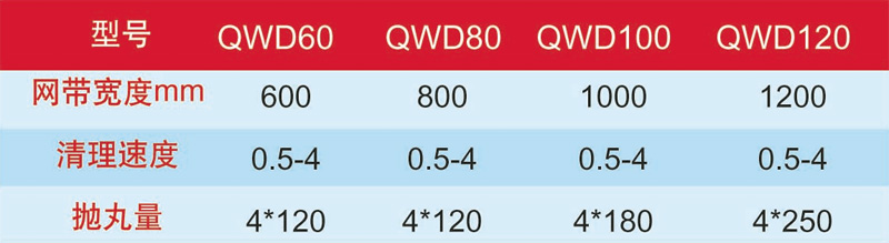 QWD系列网带式抛丸清理机主要用于薄壁铸件、薄壁和脆弱的铁或铝合金铸件、陶瓷等小型零件的表面抛丸清理,亦可用于机械零件抛丸强化。具有连续性好,清理效率高,变形小、无地坑等优点。